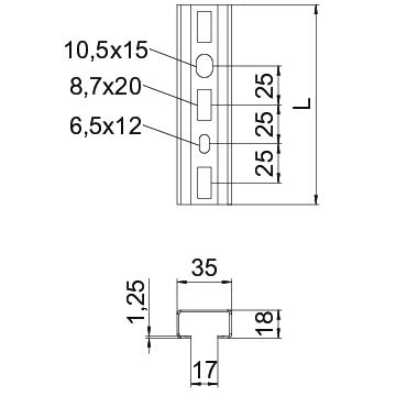 Breakable no CO2 Footprint (GWP) Cradle-to-Gate 0,7256 kg CO2e / 1 Piece Colour Jet black; RAL 9005 Dimension 400x35x18 Drill hole spacing, centre 25 mm Height 18 mm Length 400 mm Maintain electrical functions yes Material Steel Material thickness 1,25 mm Profile shape C profile Rustproof steel, pickled no Slot width 17 mm Static value ly 0,41 cm⁴ Static value lz 1,81 cm⁴ Static value Wy 0,41 cm³ Static value Wz 1,03 cm³ Surface PES135 - Polyester Type of perforation Perforated back Version for Single profile Width 35 mm With perforation yes With toothing no - All types