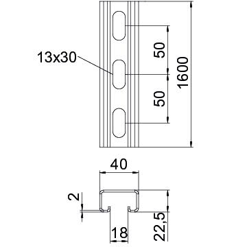 CO2 Footprint (GWP) Cradle-to-Gate 5,3312 kg CO2e / 1 Piece Dimension 1600x40x22,5 Dimension L 1600 mm Drill hole spacing, centre 50 mm Height 22,5 mm Hole shape (ETIM) Long slot Hole size 30x13 mm Hole width 13 mm Length 1600 mm Maintain electrical functions yes Material Steel Material thickness 2 mm Profile shape C profile Slot width 18 mm Static value A 1,74 cm² Static value ly 1,86 cm⁴ Static value lz 4,46 cm⁴ Static value Wy 1,05 cm³ Static value Wz 2,23 cm³ Surface Hot-dip galvanised Type of perforation Perforated back Version for Single profile Width 40 mm With perforation yes - All types
