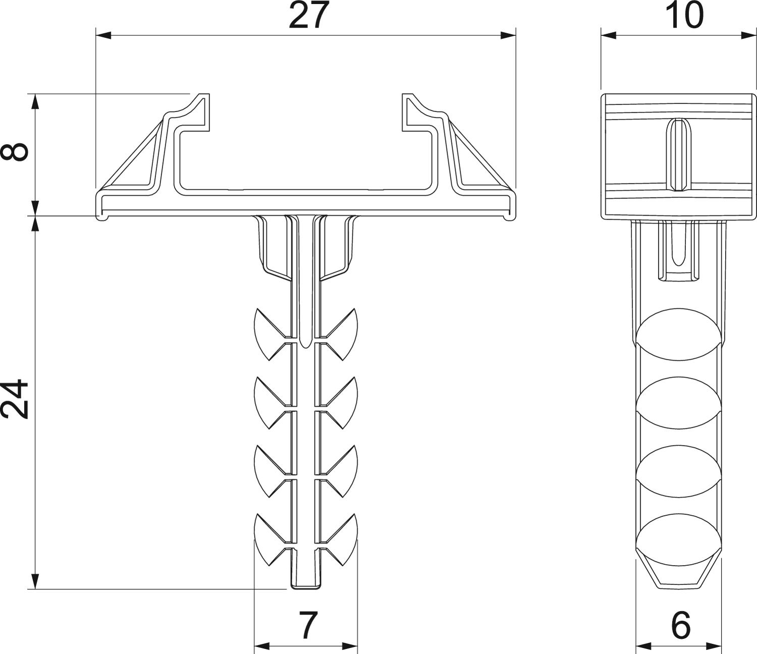CO2 Footprint (GWP) Cradle-to-Gate 0,0061 kg CO2e / 1 Piece Colour Light grey; RAL 7035 Diameter 6 mm Dimension 6x26mm Dimension L 26 mm Drill hole depth 30 mm Drill hole diameter, min. 6 mm Halogen-free yes Length 26 mm Material Polyamide Suitable for fastening with cable ties no Suitable for hexagonal wood screw no Version for Push-fit anchor With bolts no - All types