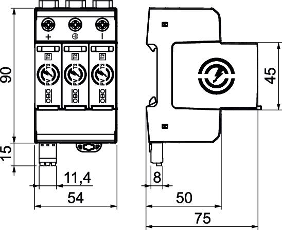 Conductor cross-section, flexible (fine-wire), max. 4 AWG Conductor cross-section, flexible (fine-wire), max. 35 mm² Conductor cross-section, flexible (fine-wire), min. 2,5 mm² Conductor cross-section, flexible (fine-wire), min. 16 AWG Conductor cross-section, rigid (single-wire/multiwire), max. 2 AWG Conductor cross-section, rigid (single-wire/multiwire), max. 35 mm² Conductor cross-section, rigid (single-wire/multiwire), min. 16 AWG Conductor cross-section, rigid (single-wire/multiwire), min. 2,5 mm² Connection cross-section, FM terminals, max. 1,5 mm² Connection cross-section, FM terminals, max. 16 AWG Connection cross-section, FM terminals, min. 0,25 mm² Connection cross-section, FM terminals, min. 23 AWG DC network form yes Dimension 1100V DC FM contacts Changeover Height 110 mm Humidity, max. 95 % Humidity, min. 5 % Installation type DIN rail 35 mm Integrated back-up fuse no IT network form no Length 75 mm Lightning protection zone LPZ 0→2 Max. PV voltage 1100 V Maximum continuous voltage DC 1100 V Maximum discharge current (8/20 μs) 40 kA Network form DC Nominal discharge current (8/20 µs) 20 kA Other network form no Permitted temperature range, max. 85 °C Permitted temperature range, min. -40 °C Pole number 3 Pole version 3 Protection rating IP20 Response time <25 ns Signalling on device Visual SPD to EN 61643-11 Type 2 SPD to IEC 61643-1 Class II Suitable for outdoor use no Switching power AC 250 V; 1,0 A / 125 V; 1,0 A Switching power DC 48 V; 0,5 A / 24 V; 0,5 A / 12 V; 0,5 A Test class, type 2 yes TN network form no TN-C network form no TN-C-S network form no TN-S network form no Torque 4,5 Nm TT network form no Version for 3-pole for PV systems Width 54 mm - All types