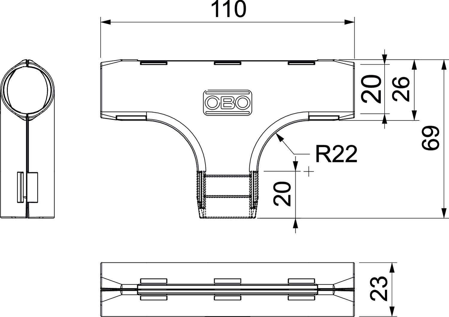Brushed surface no CO2 Footprint (GWP) Cradle-to-Gate 0,0899 kg CO2e / 1 Piece Colour Light grey; RAL 7035 Dimension M20 Dimension B 26 mm Dimension B2 110 mm Dimension d 20 mm Dimension L 69 mm Dimension L1 20 mm Dimension R 22 mm Halogen-free yes Material Polypropylene Permitted temperature range, max. 60 °C Polished surface no Shape T piece Size M20 Version for Connector With sleeve no - All types
