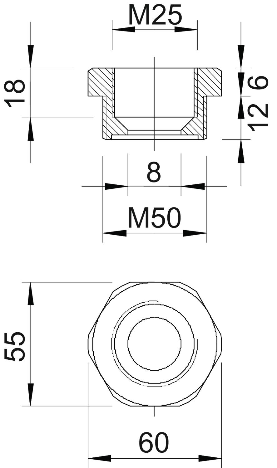 CO2 Footprint (GWP) Cradle-to-Gate 0,0897 kg CO2e / 1 Piece Colour Light grey; RAL 7035 Dimension M50-M25 Dimension E 60 mm Dimension L 18 mm Dimension L1 12 mm Dimension L2 6 mm Dimension L3 18 mm explosion-proof no Halogen-free yes Material Polyamide Nickel-plated no Thread dimension, metric, external 50 Thread dimension, metric, internal 25 Thread length 12 mm Thread type: External thread Metric Thread type: Internal thread Metric WAF 55 - All types