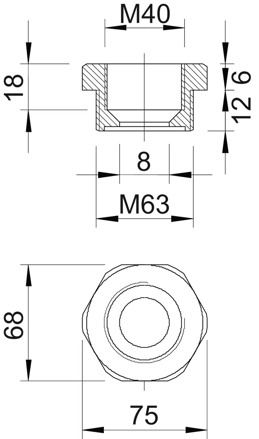 CO2 Footprint (GWP) Cradle-to-Gate 0,1202 kg CO2e / 1 Piece Colour Light grey; RAL 7035 Dimension M63-M40 Dimension E 75 mm Dimension L 18 mm Dimension L1 12 mm Dimension L2 6 mm Dimension L3 18 mm explosion-proof no Halogen-free yes Material Polyamide Nickel-plated no Thread dimension, metric, external 63 Thread dimension, metric, internal 40 Thread length 12 mm Thread type: External thread Metric Thread type: Internal thread Metric WAF 68 - All types