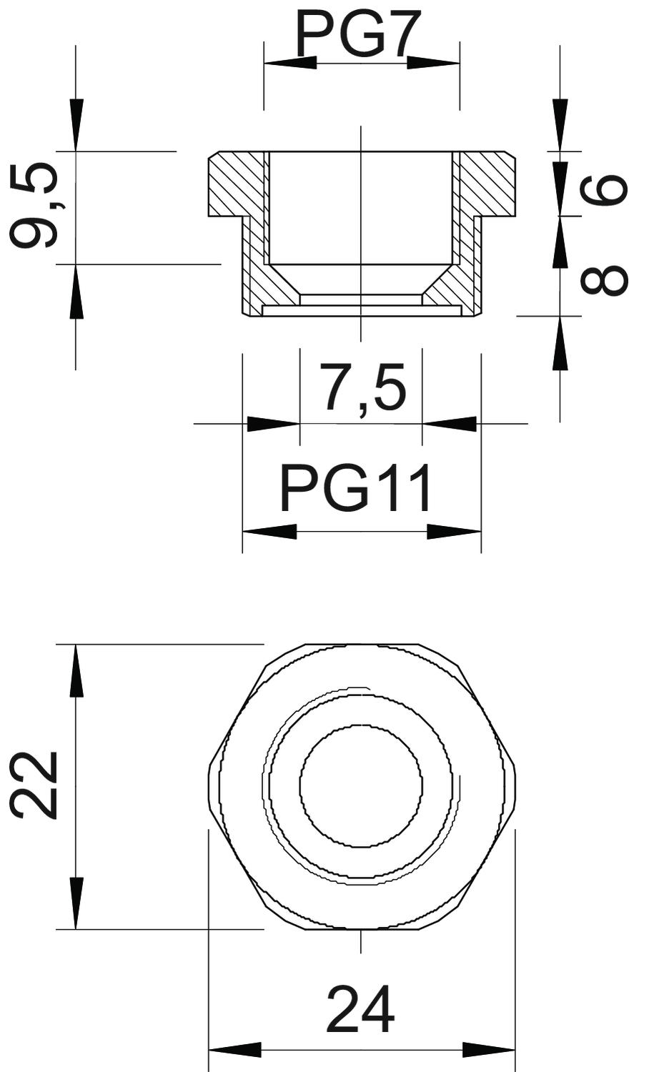 Product descriptionReduction with PG internal and external thread to DIN 40430 for mounting plastic cable glands on enclosures. Protection class IP54 without additional connecting seal. Protection class up to IP68 possible with additional connecting seal, e.g. O-ring or flat sealing ring.