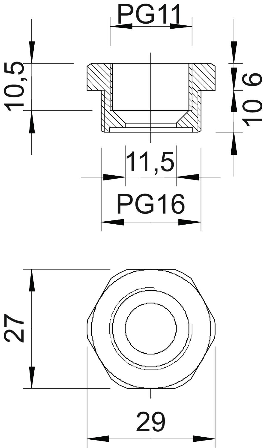 CO2 Footprint (GWP) Cradle-to-Gate 0,0213 kg CO2e / 1 Piece Colour Light grey; RAL 7035 Dimension PG16-PG11 Dimension D 11,5 mm Dimension E 29 mm Dimension L1 10 mm Dimension L2 6 mm Dimension L3 10,5 mm explosion-proof no Halogen-free yes Material Polyamide Nickel-plated no Thread dimension, PG, external 16 Thread dimension, PG, internal 11 Thread length 10 mm Thread type: External thread PG Thread type: Internal thread PG WAF 27 - All types
