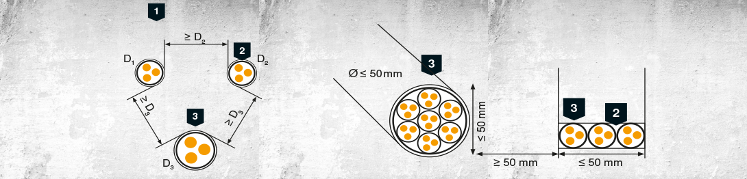 If only individual cables or small cable bundles are run through fire-resistant components, they can be routed through individual holes with an appropriate spacing. The individual holes must be closed off with mineral substances or substances which foam up in a fire. In so doing, the greatest diameter defines the distance to the smaller cables. The risk of fire spread does not increase in this manner. Individual cables without a diameter limit are permitted without insulation - a ring gap closure around the cable is sufficient.