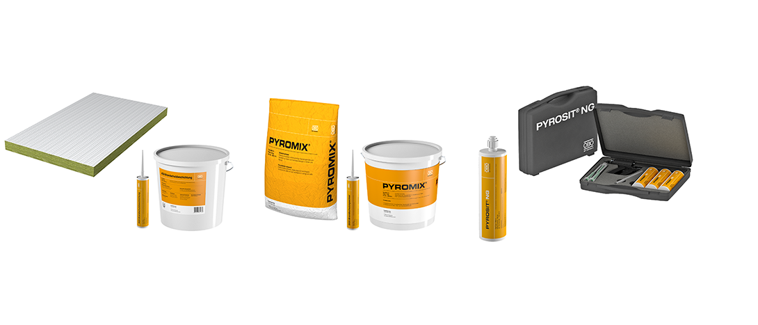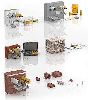 Special mortar, mineral fibre plates with coating, fire protection foam, 1-component compounds, foams and fittings, boxes, silicones and special rubberised modules. All the systems possess special fire protection components and additives, which fulfil a safe function in case of fire in accordance with the testing standard.