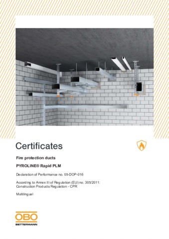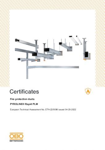 The PYROLINE® Rapid PLM fire protection duct system is classified according to EN 13501-2 and possesses the fire resistance classes EI30 (ho i↔o), EI60 (ho i↔o), EI90 (ho i↔o) and E120 (ho i↔o). A European Technical Assessment (ETA), based on a European Assessment Document (EAD) serves as the proof of suitability for the construction products and the construction sets of the system.