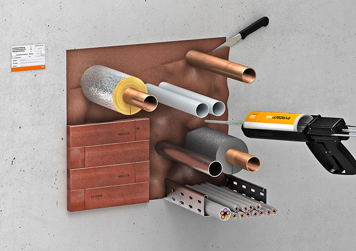 PYROSIT® NG makes the fire protection system perfect. The two-component foam can be distributed precisely using the cartridge pistol. A new feature from OBO is a tempering box for the foam, which ensures an optimum cartridge temperature. If there is a fire, the foam, blocks and plug expand, forming an insulating layer, which prevents the spread of fire.