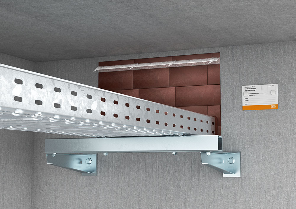 In accordance with the proofs of suitability, most fire insulation requires mechanical support of the passed-through installations made of non-combustible material. This is intended to prevent a negative impact on the insulation in case of fire. With the support structures with pendulum and bracket, OBO can offer two sets to create the required mechanical support.