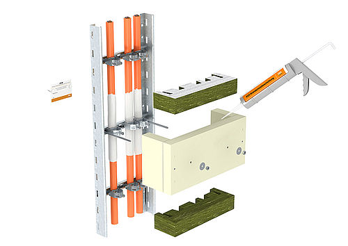 The most effective strain relief solution has been shown to be housings made of non-combustible material with integrated insulation. These are mounted directly over a clip row, meaning that the complex loops can also be avoided for storey heights of over 3.5 metres. The action principle is similar to that of the cable insulation in the storey ceiling: If there is a fire, the series of clips in the housing remains relatively cold and the cables remain clamped, effectively preventing breaking.