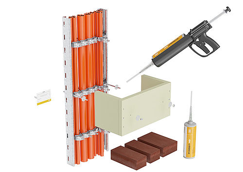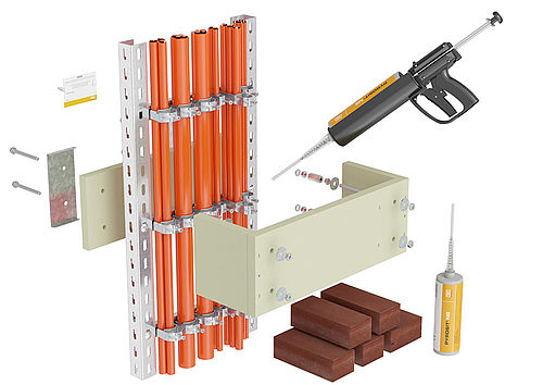 The strain relief consists of a U-shaped housing, a matching lock plate made from the same non-combustible material and a mounting set for the installation on vertical ladders consisting of U profiles. In this variant too, the filling takes place using PYROPLUG® Block foam blocks and the PYROSIT® NG fire protection foam Foam filling