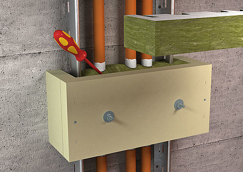 When the housing has been attached, the mineral fibre plates are adjusted to the existing insulation and then the residual joints around the cables are also filled with the PYROCOAT® ASX and the surface of the plates in the housing are sealed. In order to achieve a secure function, the dry layer thickness must be 1 mm.