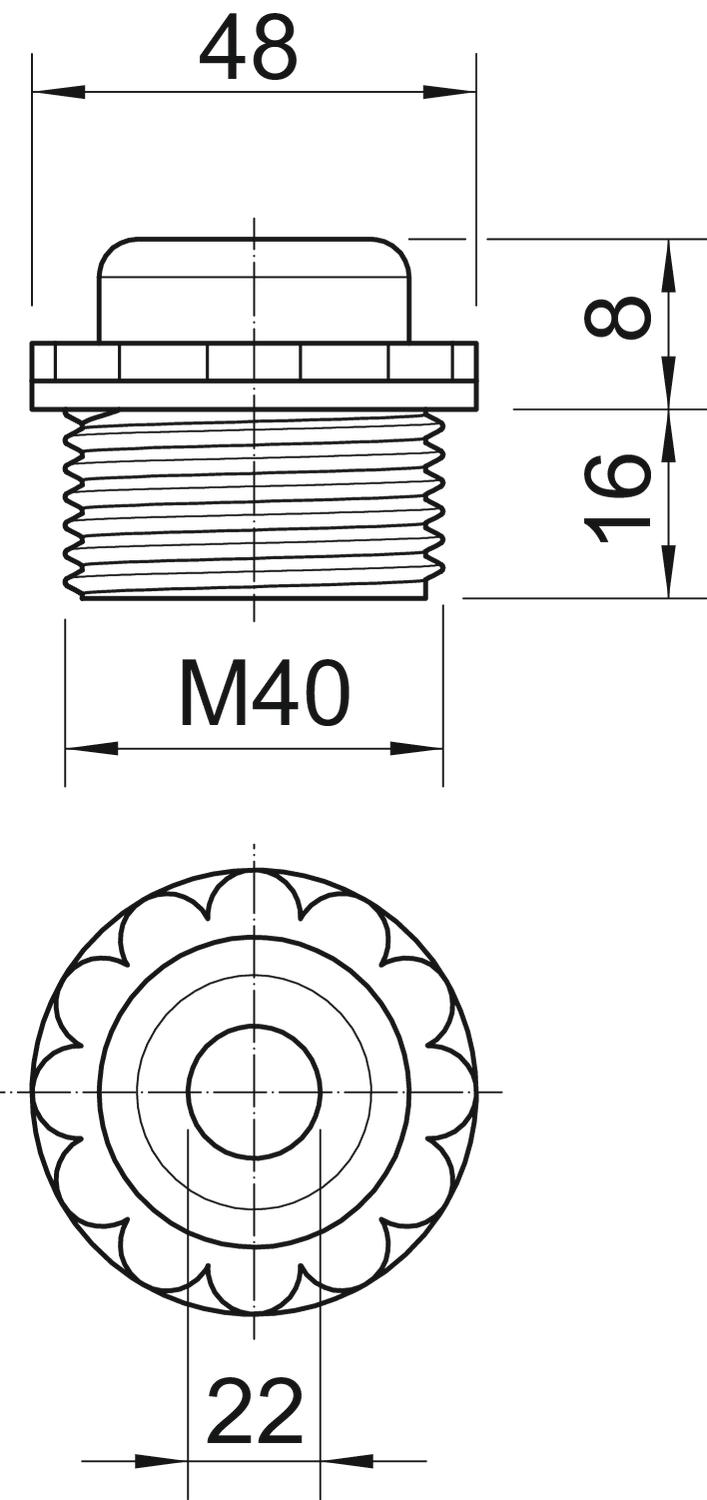 CO2 Footprint (GWP) Cradle-to-Gate 0,0347 kg CO2e / 1 Piece Colour Light grey; RAL 7035 Dimension M40 Dimension D 22 mm Dimension E 48 mm Dimension L1 16 mm Dimension L2 8 mm Halogen-free yes Material Polyethylene Protection rating IP54 Size M40 Thread length 16 mm WAF 44 - All types