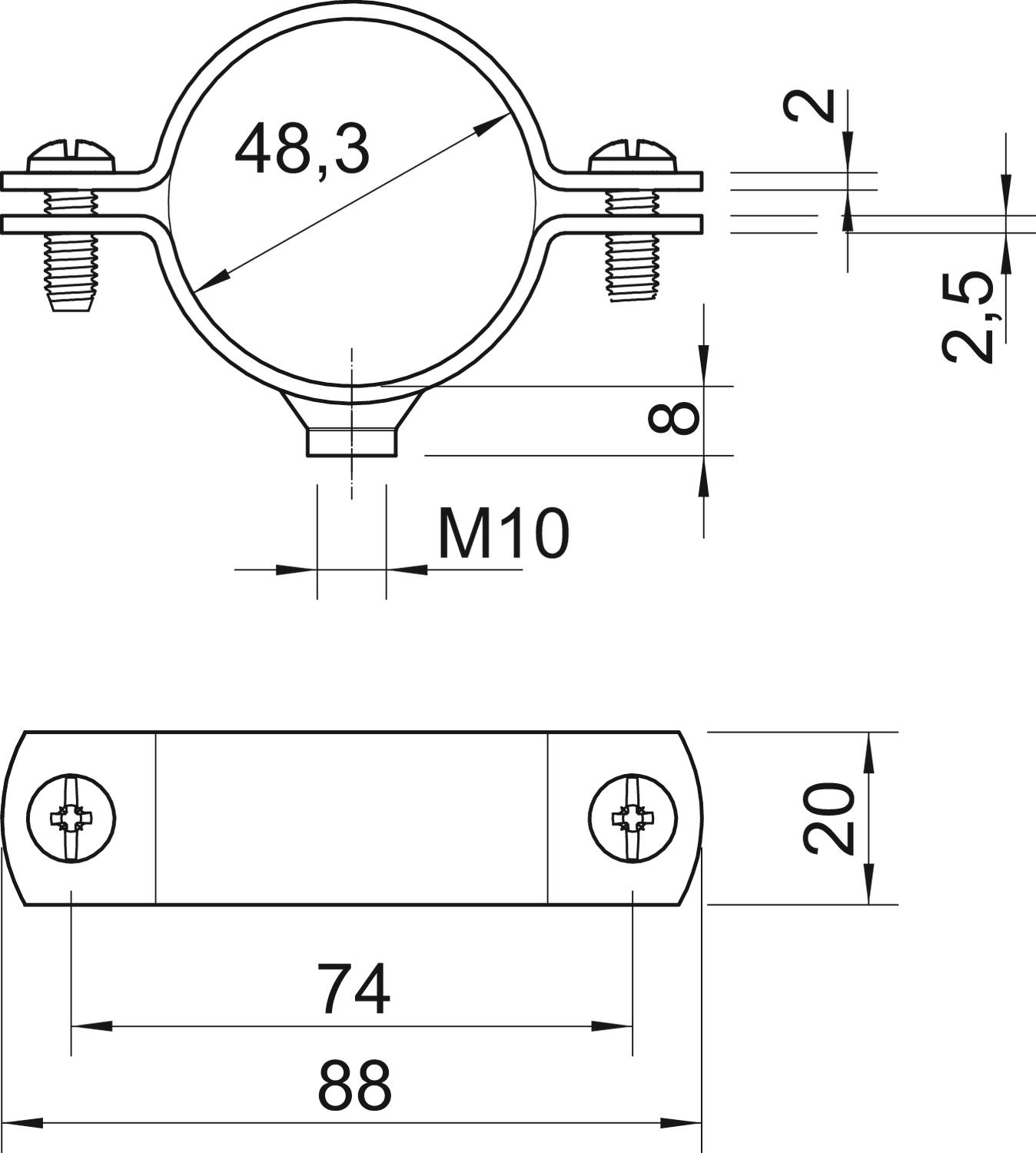 Bolt M6 x 20 Clamping range D, max. 48,5 mm Clamping range D, min. 45,5 mm CO2 Footprint (GWP) Cradle-to-Gate 0,1998 kg CO2e / 1 Piece Dimension 1 1/2" Dimension A 88 mm Dimension B 72 mm Dimension L 88 mm Dimension t 2 mm Dimension t1 (mm) 2,5 Dimension x 3 mm Fastening type Screw hole For diameter 48,5 for pipe diameter M50 Halogen-free no Hole size M10 mm Length 88 mm Material Steel Plastic-covered no Size 1 1/2" Suitable in fire protection area no Surface Hot-dip galvanised Thread M10 UV-resistant yes Version for Closed Width 20 mm - All types