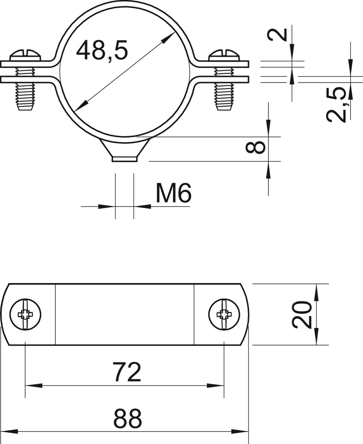 Bolt M6 x 18 Clamping range D, max. 48,5 mm Clamping range D, min. 45,5 mm CO2 Footprint (GWP) Cradle-to-Gate 0,2043 kg CO2e / 1 Piece Dimension 1 1/2" Dimension A 88 mm Dimension B 72 mm Dimension D 48,5 mm Dimension d min. 48,5 mm Dimension t 2,5 mm Dimension t1 (mm) 2 Dimension x 3 mm Fastening type Screw hole For diameter 48,5 for pipe diameter M50 Halogen-free no Hole size M6 mm Length 88 mm Material Steel Material thickness 2,5 mm Plastic-covered no Size 1 1/2" Suitable in fire protection area no Surface Hot-dip galvanised Thread M6 UV-resistant yes Version for Closed Width 20 mm - All types