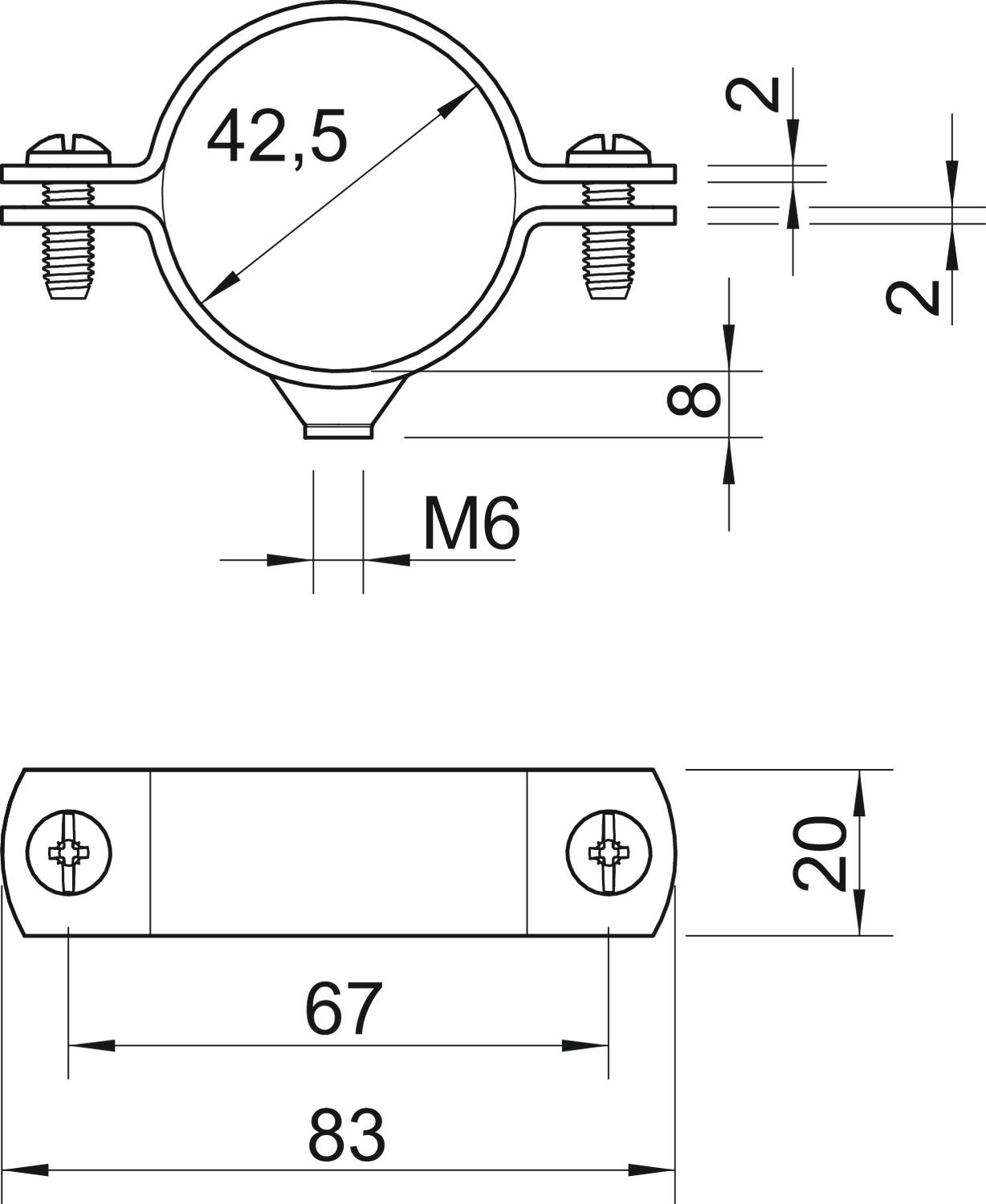 Bolt M6 x 18 Clamping range D, max. 42,5 mm Clamping range D, min. 39,5 mm CO2 Footprint (GWP) Cradle-to-Gate 0,1731 kg CO2e / 1 Piece Dimension 1 1/4" Dimension A 83 mm Dimension B 67 mm Dimension D 42,5 mm Dimension d min. 42,5 mm Dimension t 2 mm Dimension t1 (mm) 2 Dimension x 3 mm Fastening type Screw hole For diameter 42,5 for pipe diameter M40 Halogen-free no Hole size M6 mm Length 83 mm Material Steel Material thickness 2 mm Plastic-covered no Size 1 1/4" Suitable in fire protection area no Surface Hot-dip galvanised Thread M6 UV-resistant yes Version for Closed Width 20 mm - All types