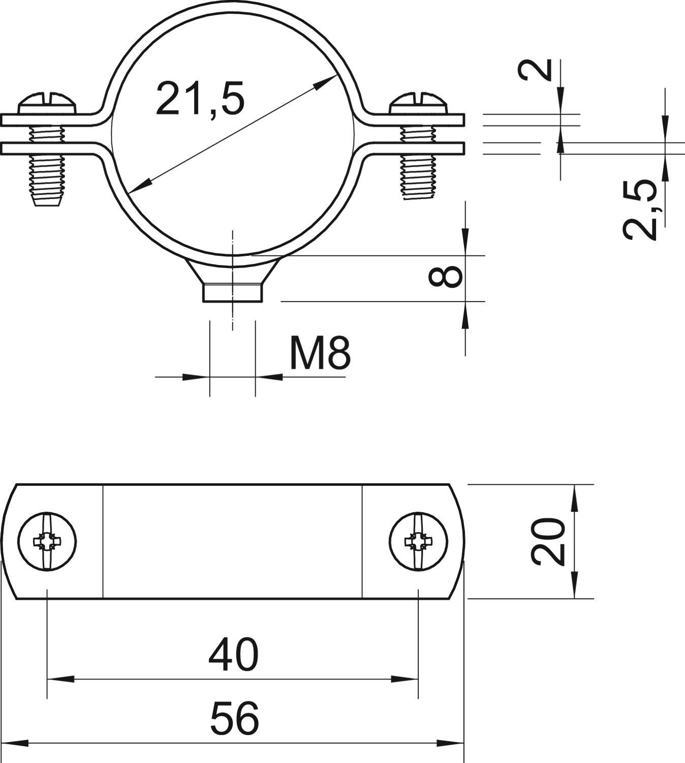 Bolt M6 x 16 Clamping range D, max. 21,5 mm Clamping range D, min. 19 mm CO2 Footprint (GWP) Cradle-to-Gate 0,1255 kg CO2e / 1 Piece Dimension 1/2" Dimension A 56 mm Dimension B 40 mm Dimension D 21,5 mm Dimension d min. 21,5 mm Dimension t 2 mm Dimension t1 (mm) 2,5 Dimension x 2,5 mm Fastening type Screw hole For diameter 21,5 for pipe diameter M20 Halogen-free no Hole size M8 mm Length 56 mm Material Steel Material thickness 2 mm Plastic-covered no Size 1/2" Suitable in fire protection area no Surface Hot-dip galvanised Thread M8 UV-resistant yes Version for Closed Width 20 mm - All types