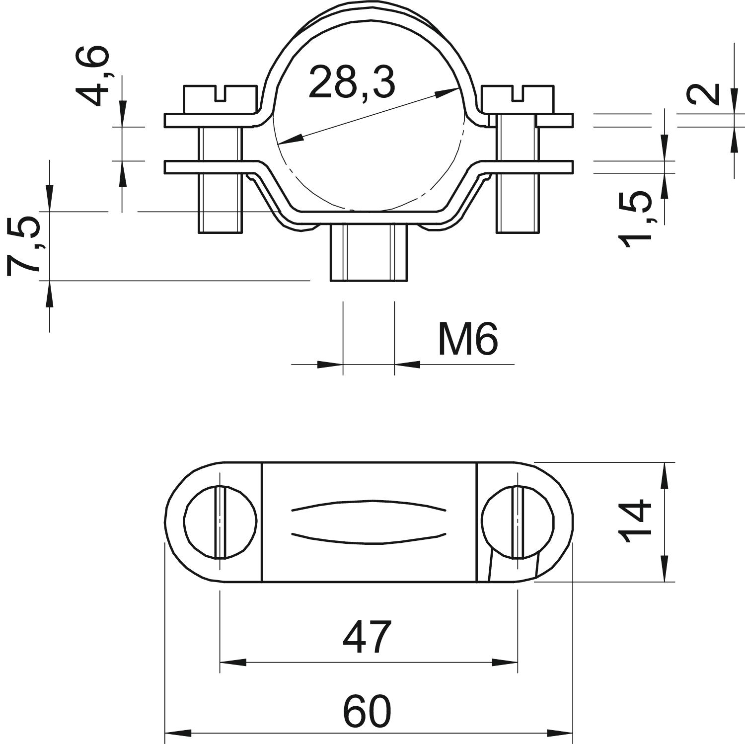 Bolt M5 x 14 Clamping range D, max. 29 mm Clamping range D, min. 24 mm CO2 Footprint (GWP) Cradle-to-Gate 0,0983 kg CO2e / 1 Piece Dimension 24-29mm Dimension A 60 mm Dimension B 47 mm Dimension b 14 mm Dimension D 28,3 mm Dimension d min. 28,3 mm Dimension H 7,5 mm Dimension L 60 mm Dimension t1 (mm) 1,5 Dimension t2 (mm) 2 Dimension x 4,6 mm Fastening type Screw hole Halogen-free no Hole size M6 mm Length 60 mm Material Steel Material thickness 1,5 mm Plastic-covered no Size M25 Surface Electrogalvanized UV-resistant yes Version for Closed Width 14 mm - All types