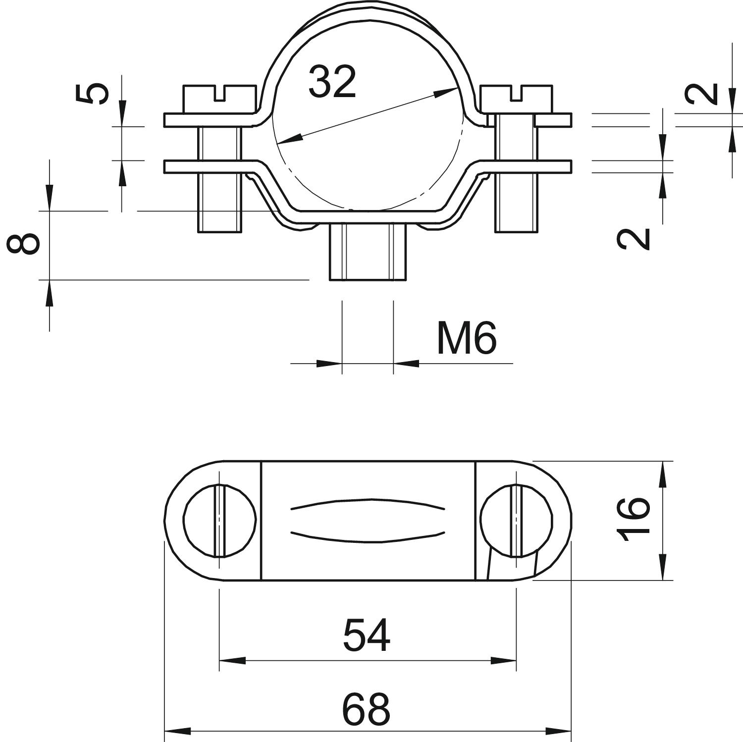 Bolt M5 x 14 Clamping range D, max. 34 mm Clamping range D, min. 30 mm CO2 Footprint (GWP) Cradle-to-Gate 0,1337 kg CO2e / 1 Piece Dimension 30-34mm Dimension A 68 mm Dimension B 54 mm Dimension b 16 mm Dimension D 32 mm Dimension H 8 mm Dimension t1 (mm) 2 Dimension t2 (mm) 2 Dimension x 5 mm Fastening type Screw hole Halogen-free no Hole size M6 mm Length 68 mm Material Steel Material thickness 2 mm Plastic-covered no Size M32 Surface Electrogalvanized UV-resistant yes Version for Closed Width 16 mm - All types
