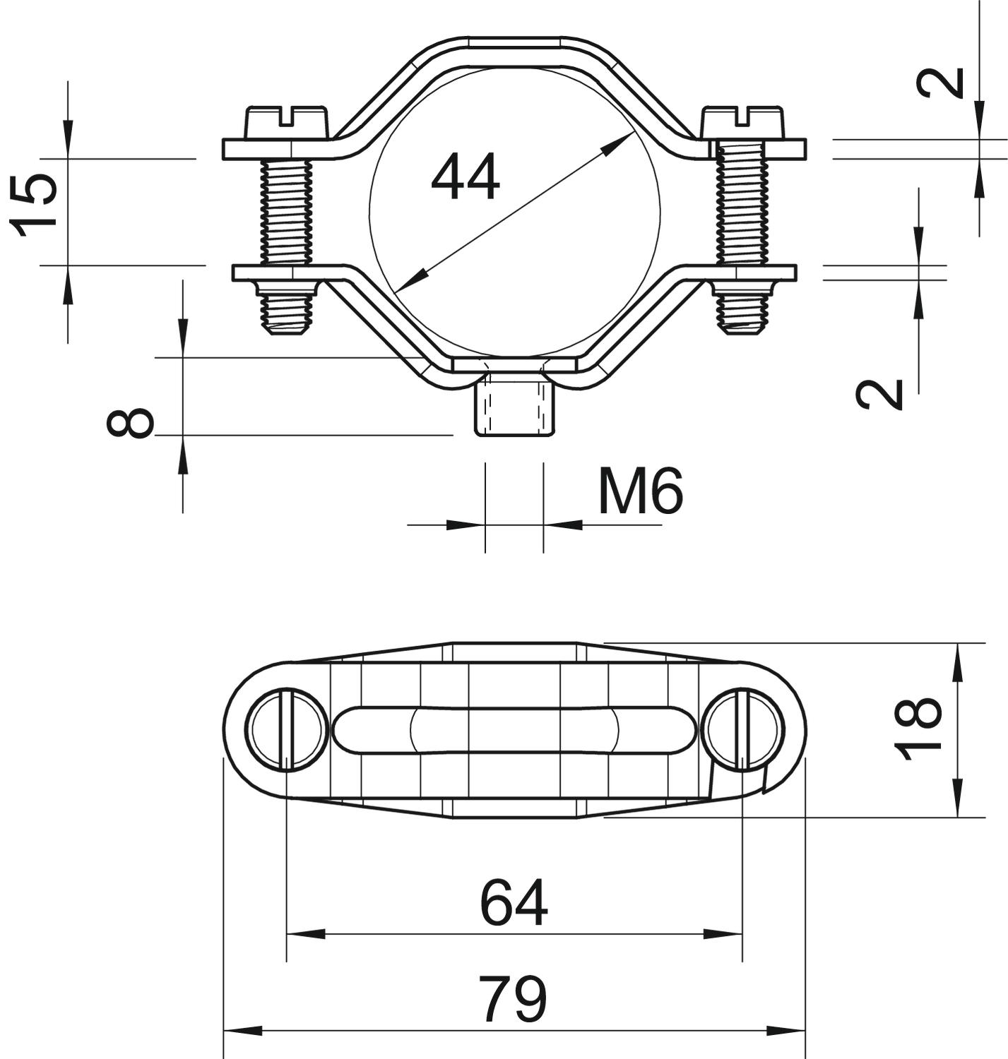 Bolt M5 x 22 Clamping range D, max. 44 mm Clamping range D, min. 30 mm CO2 Footprint (GWP) Cradle-to-Gate 0,1414 kg CO2e / 1 Piece Dimension 30-44mm Dimension A 79 mm Dimension B 64 mm Dimension b 18 mm Dimension D 44 mm Dimension d min. 44 mm Dimension H 8 mm Dimension L 79 mm Dimension t1 (mm) 2 Dimension t2 (mm) 2 Dimension x 15 mm Fastening type Screw hole Halogen-free no Hole size M6 mm Length 79 mm Material Steel Material thickness 2 mm Plastic-covered no Suitable in fire protection area no Surface Electrogalvanized UV-resistant yes Version for Closed Width 16 mm - All types