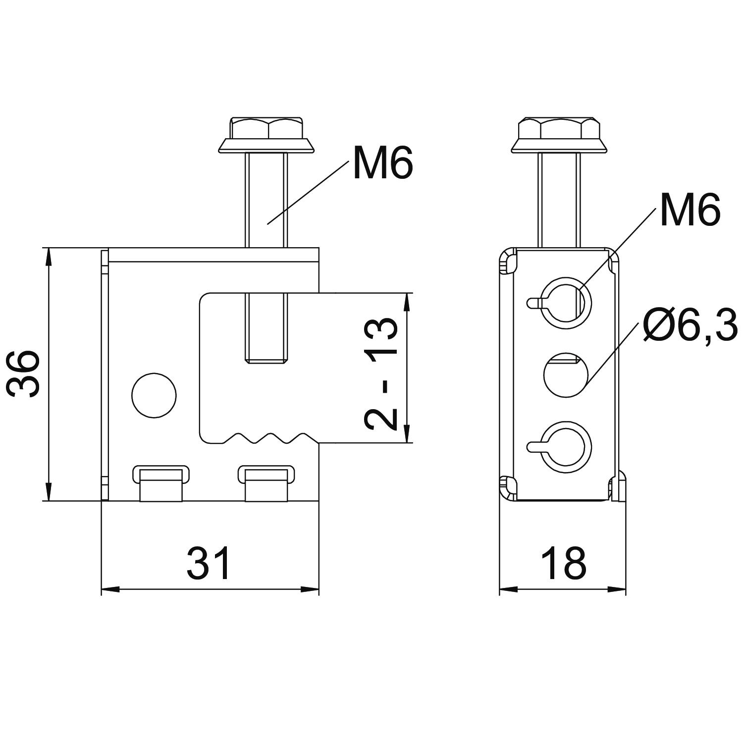 Breaking load 0,55 kN Colour zinc Connection type/component Miscellaneous Dimension 2-13mm Fastening type Bolts Flange thickness F max. 16 mm Flange thickness F min. 2 mm Height 36 mm Hinge, adjustable no Hinged no Length 31 mm Material Steel Surface Zinc slat Thread M6 Thread metric 6 Width 18 mm - All types