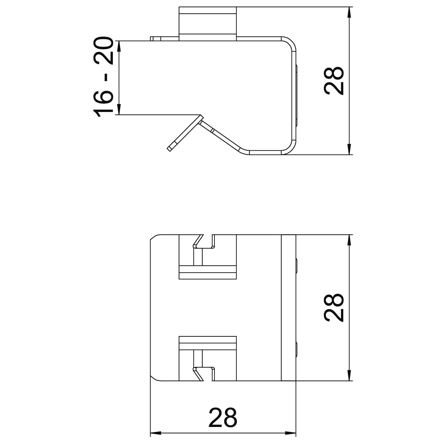 Colour zinc Connection type/component Miscellaneous Dimension 16-20mm Dimension L 14 mm Fastening type Clamp Flange thickness F max. 20 mm Flange thickness F min. 16 mm Height 28 mm Hinge, adjustable no Hinged no Length 28 mm Material Steel Surface Zinc slat Width 28 mm - All types