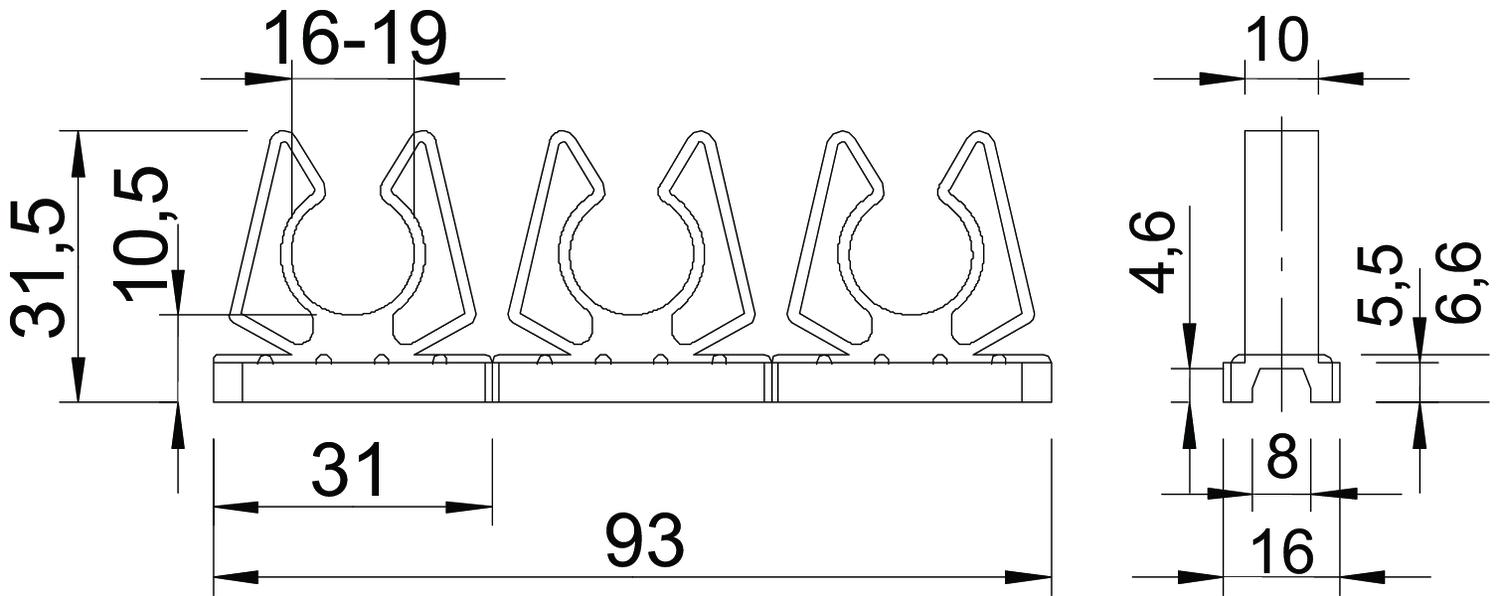 Clamping range D, max. 19 mm Clamping range D, min. 16 mm CO2 Footprint (GWP) Cradle-to-Gate 0,0583 kg CO2e / 1 Piece Colour Stone grey; RAL 7030 Dimension 16-19mm Dimension A 31 mm Dimension B 93 mm Dimension H 31,5 mm Dimension H1 10,5 mm Fastening type Rail fastening for rail with slot width (with interval), max. 12 mm for rail with slot width (with interval), min. 11 mm Halogen-free yes Impact-resistant no Material Polyethylene Number of cables/pipes 1 Number of clips per strip 3 Plastic-covered no Suitable in fire protection area no UV-resistant no Version for Closed - All types