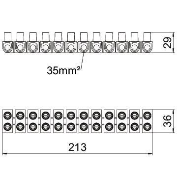 Ambient temperature 80 °C Closing plate required no Colour White Connectable conductor cross-section, fine-wire without wire-end ferrule, max. 25 mm² Connectable conductor cross-section, fine-wire without wire-end ferrule, min. 25 mm² Connectable conductor cross-section, multi-wire, max. 35 mm² Connectable conductor cross-section, multi-wire, min. 35 mm² Connection position Side Cross-section Max. attachment each side: 35mm² flexible or 25 mm² rigid. mm² Dimension 35mm² Drill hole spacing, centre 18 mm Explosion-tested version no Height 29,2 mm Length 212,6 mm Material Polypropylene No. of terminals 12 Nominal cross-section, min. 35 mm² Nominal current 125 A Nominal voltage 750 V Number of screwless terminals per pole 2 Permitted temperature range, max. 80 °C Permitted temperature range, min. -5 °C Pole number 12 Suitable for flexible conductors yes Suitable for multi-wire conductors yes Suitable for solid conductors yes Transparent no Version of electrical connection 1 Screw connection Version of electrical connection 2 Screw connection Width 36,4 mm - All types