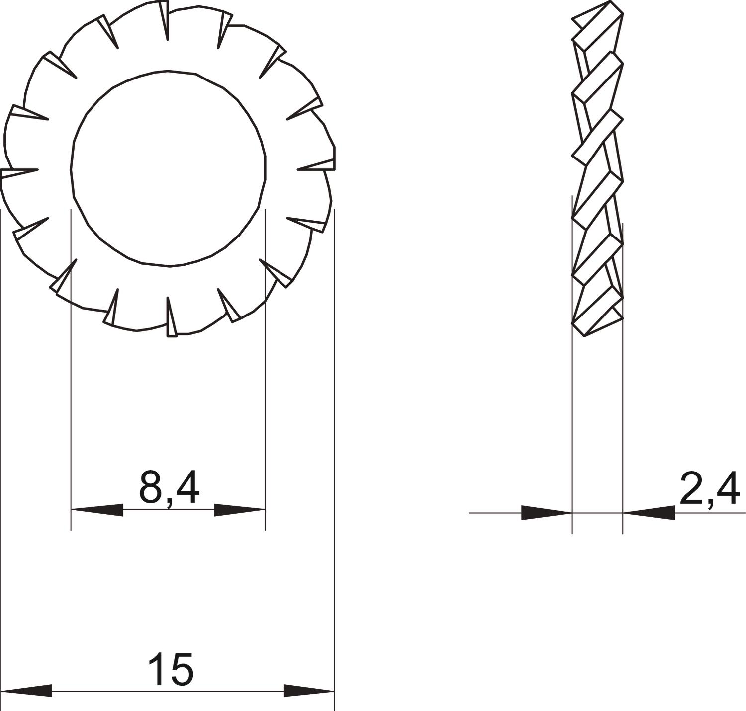 CO2 Footprint (GWP) Cradle-to-Gate 0,0032 kg CO2e / 1 Piece Dimension M8 Dimension d 8,4 mm Dimension d min. 15 mm Dimension h 2,4 mm External diameter 15 mm Height 2,4 mm Inner diameter 0,33 mm Lock washer version Open external gearing Material Stainless steel Plate thickness 0,09 in Surface Bright, treated Thickness 2,4 mm Thread M8 - All types