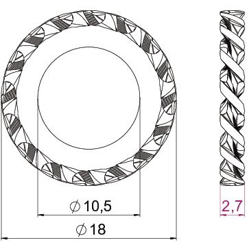 CO2 Footprint (GWP) Cradle-to-Gate 0,0033 kg CO2e / 1 Piece Dimension M10 Dimension d 10,5 mm Dimension d max. 18 mm Dimension d min. 18 mm Dimension h 2,7 mm External diameter 18 mm Height 2,7 mm Inner diameter 0,41 mm Lock washer version Open external gearing Material Steel Plate thickness 0,11 in Surface Electrogalvanized Thickness 2,7 mm Thread M10 - All types