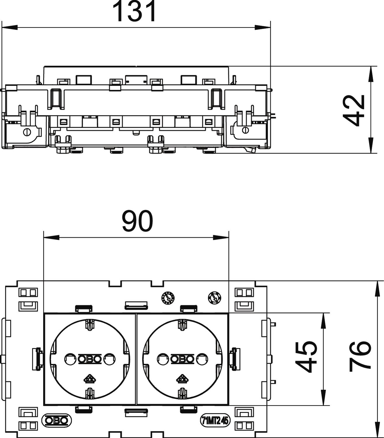 Product descriptionProtective contact socket with connection to side, double 0°, with increased touch protection, with screwless terminals, 2-pin, 16 A, 250 V~, with connection terminals to IEC 60884-1, suitable for the installation in Rapid 80 device installation trunking systems.