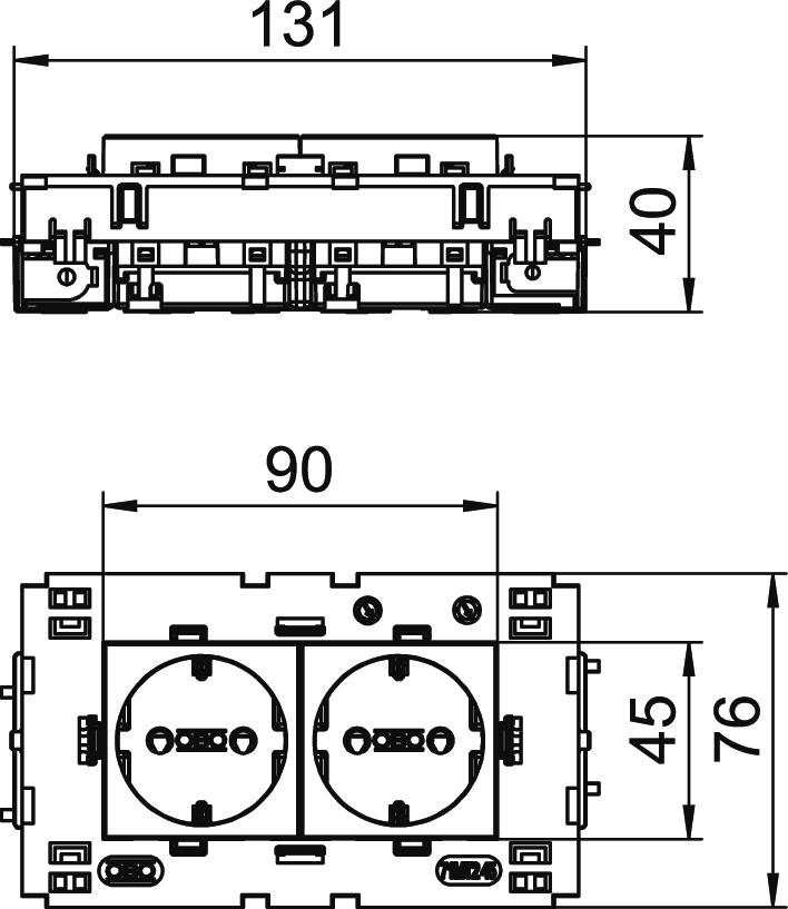 Product descriptionProtective contact socket with connection to side, double 0°, with increased touch protection, with screwless terminals, 2-pin, 16 A, 250 V~, with connection terminals to IEC 60884-1, suitable for the installation in Rapid 80 device installation trunking systems.