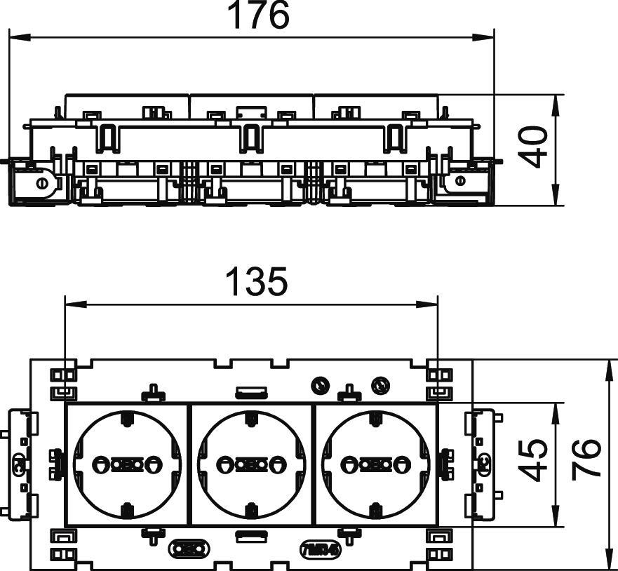 Product descriptionProtective contact socket with connection to side, triple 0°, with increased touch protection, with screwless terminals, 2-pin, 16 A, 250 V~, with connection terminals to IEC 60884-1, suitable for the installation in Rapid 80 device installation trunking systems.