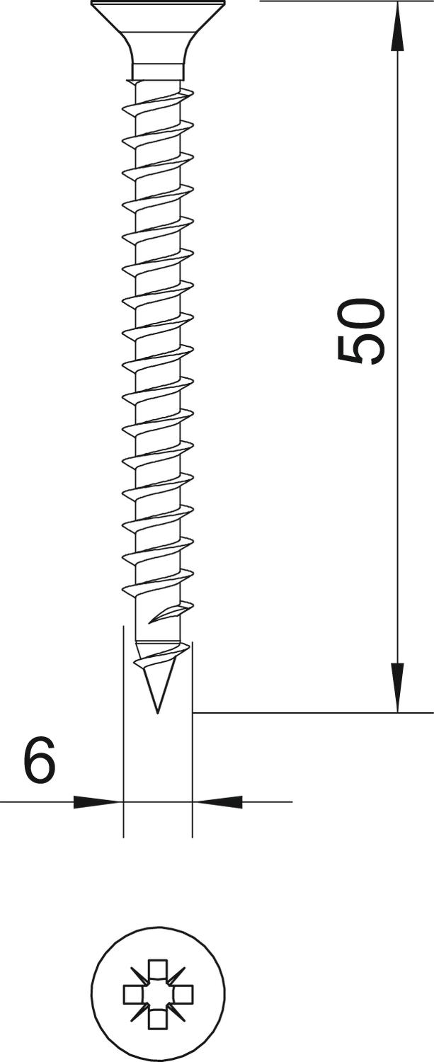 Dimension 6x50mm Dimension D 6 mm Dimension L 50 mm Hardened yes Head diameter 11 mm Head shape Countersunk head Length 50 mm Material Steel Screw system Pozidrive PZ Surface Electrogalvanized - All types