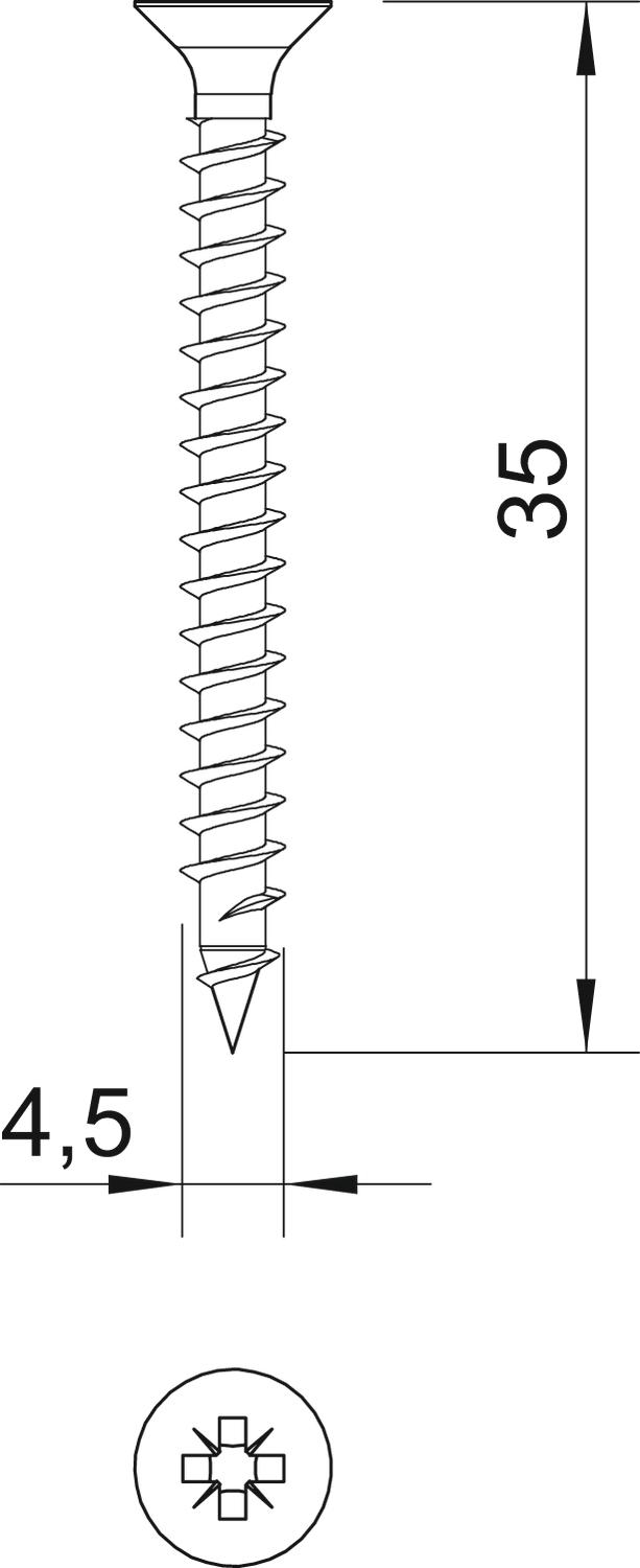 Dimension 4,5x35mm Dimension D 4,5 mm Dimension L 35 mm Hardened yes Head diameter 8,3 mm Head shape Countersunk head Length 35 mm Material Steel Screw system Pozidrive PZ Surface Electrogalvanized - All types