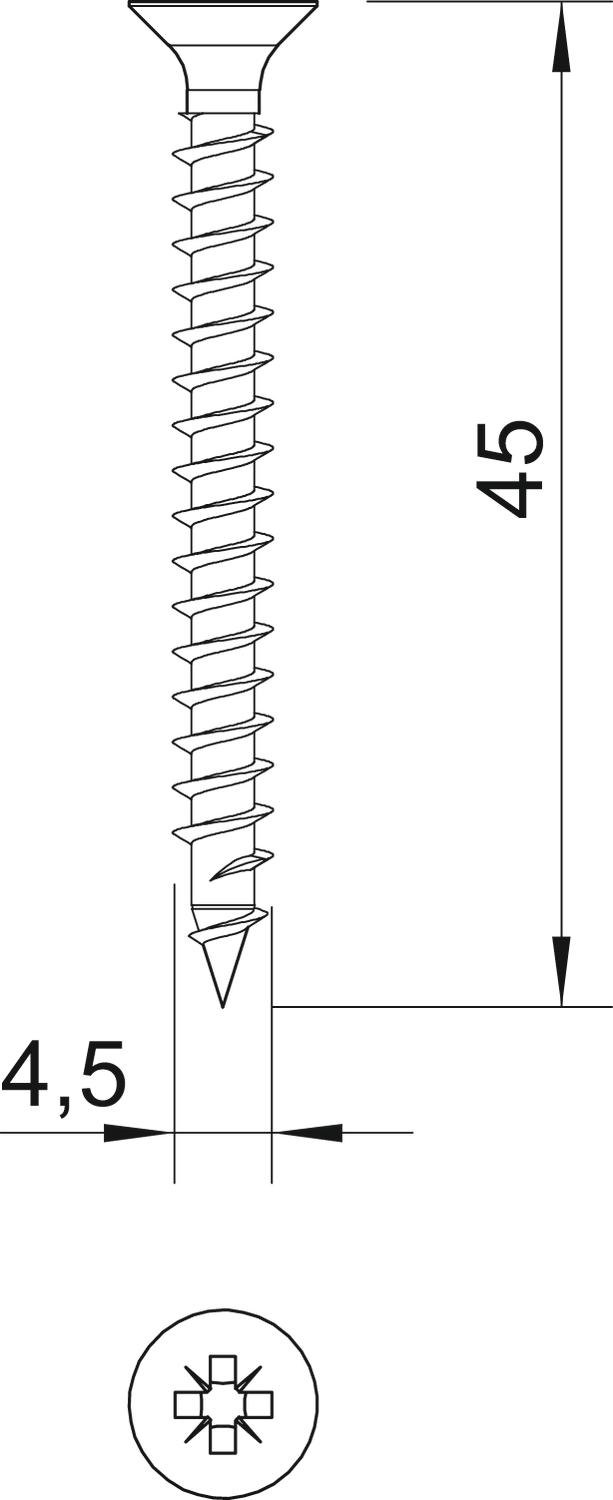 Dimension 4,5x45mm Dimension D 4,5 mm Dimension L 45 mm Hardened yes Head diameter 8,3 mm Head shape Countersunk head Length 45 mm Material Steel Screw system Pozidrive PZ Surface Electrogalvanized - All types
