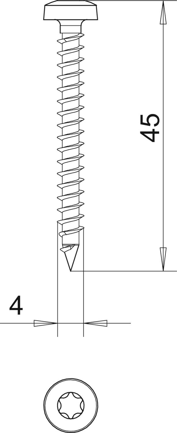 Dimension 4x45mm Dimension D 4 mm Dimension L 45 mm Hardened yes Head diameter 7,5 mm Head shape Panhead Length 45 mm Material Steel Screw system Torx Surface Electrogalvanized Thickness 4 mm Two-compartment yes - All types
