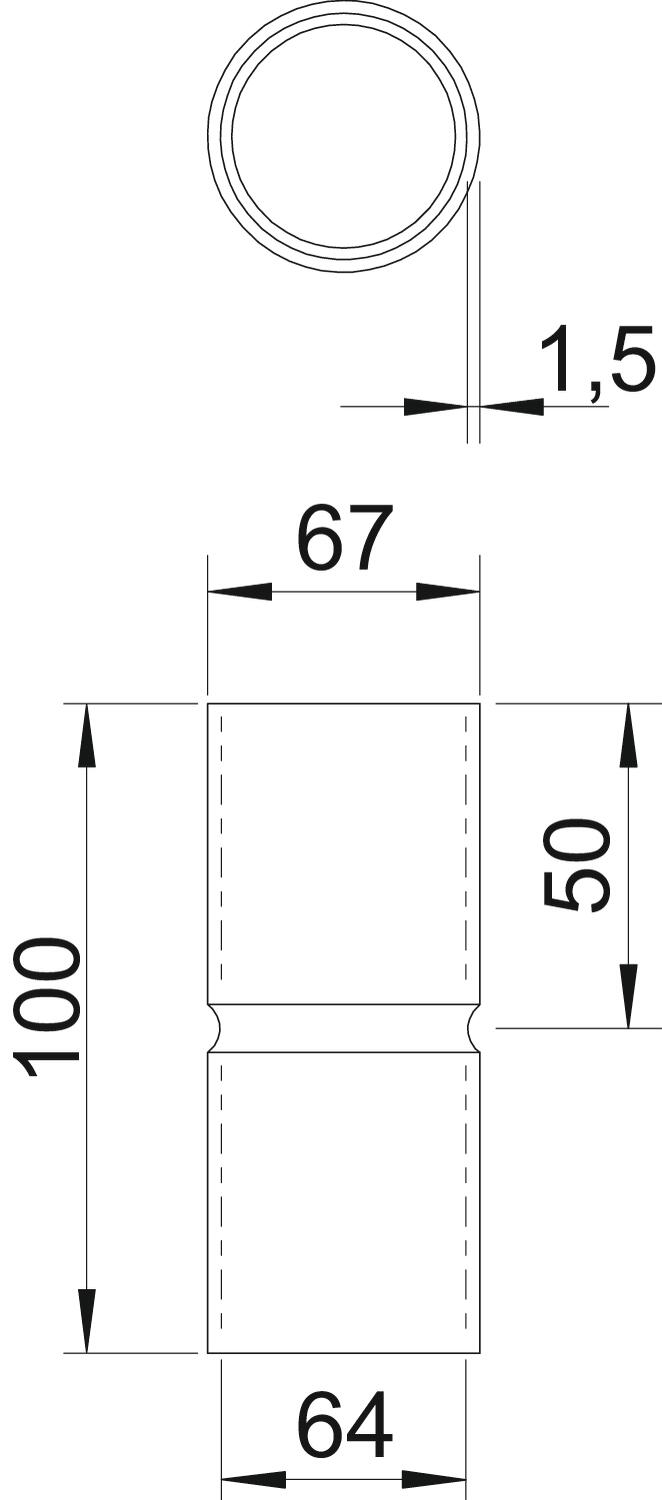 Brushed surface yes CO2 Footprint (GWP) Cradle-to-Gate 1,1513 kg CO2e / 1 Piece Dimension Ø63mm Dimension d 63,2 mm Dimension D 65,8 mm Dimension L 100 mm Dimension l 50 mm Dimension m (mm) M63 Dimension t 1,3 mm for pipe diameter 63 mm Halogen-free yes Length 100 mm Material Stainless steel 1.4571 Permitted temperature range, max. 400 °C Permitted temperature range, min. -45 °C Polished surface no Size 63 Surface Bright, treated Two-part no Version for Connector With inspection opening and lid no - All types