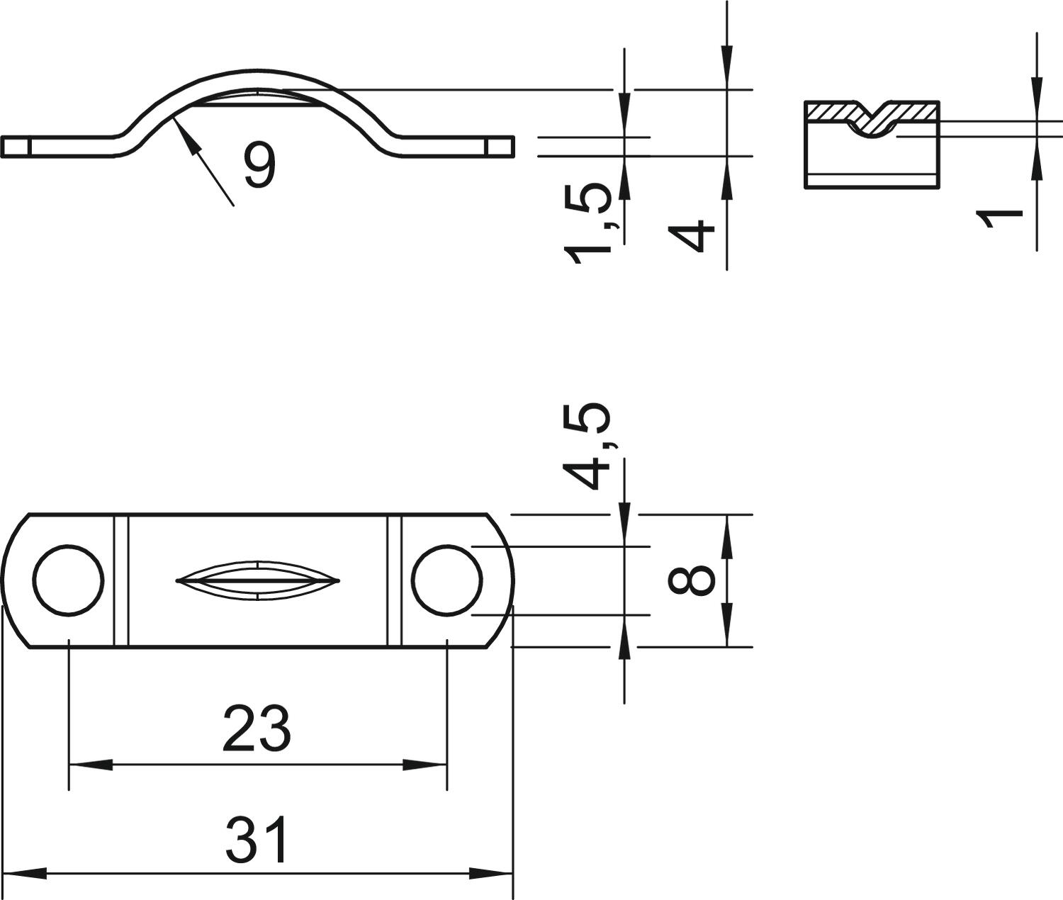 Clamping range D, max. 9 mm Clamping range D, min. 9 mm CO2 Footprint (GWP) Cradle-to-Gate 0,0099 kg CO2e / 1 Piece Dimension 9mm Dimension b 8 mm Dimension d 4,5 mm Dimension h 4 mm Dimension H1 (mm) 1 Dimension L 31 mm Dimension l 23 mm Dimension R 9 mm Dimension t 1,5 mm Distance to the wall no Fastening type Screw hole For diameter 9 Halogen-free yes Height 4 mm Hole size 4,5 mm Length 31 mm Material Steel Material thickness 1 mm Nominal diameter 9 mm Number of cables/pipes 1 Plastic-covered no Size III Suitable in fire protection area no Surface Electrogalvanized UV-resistant yes Version for Two-lobe Width 8 mm - All types