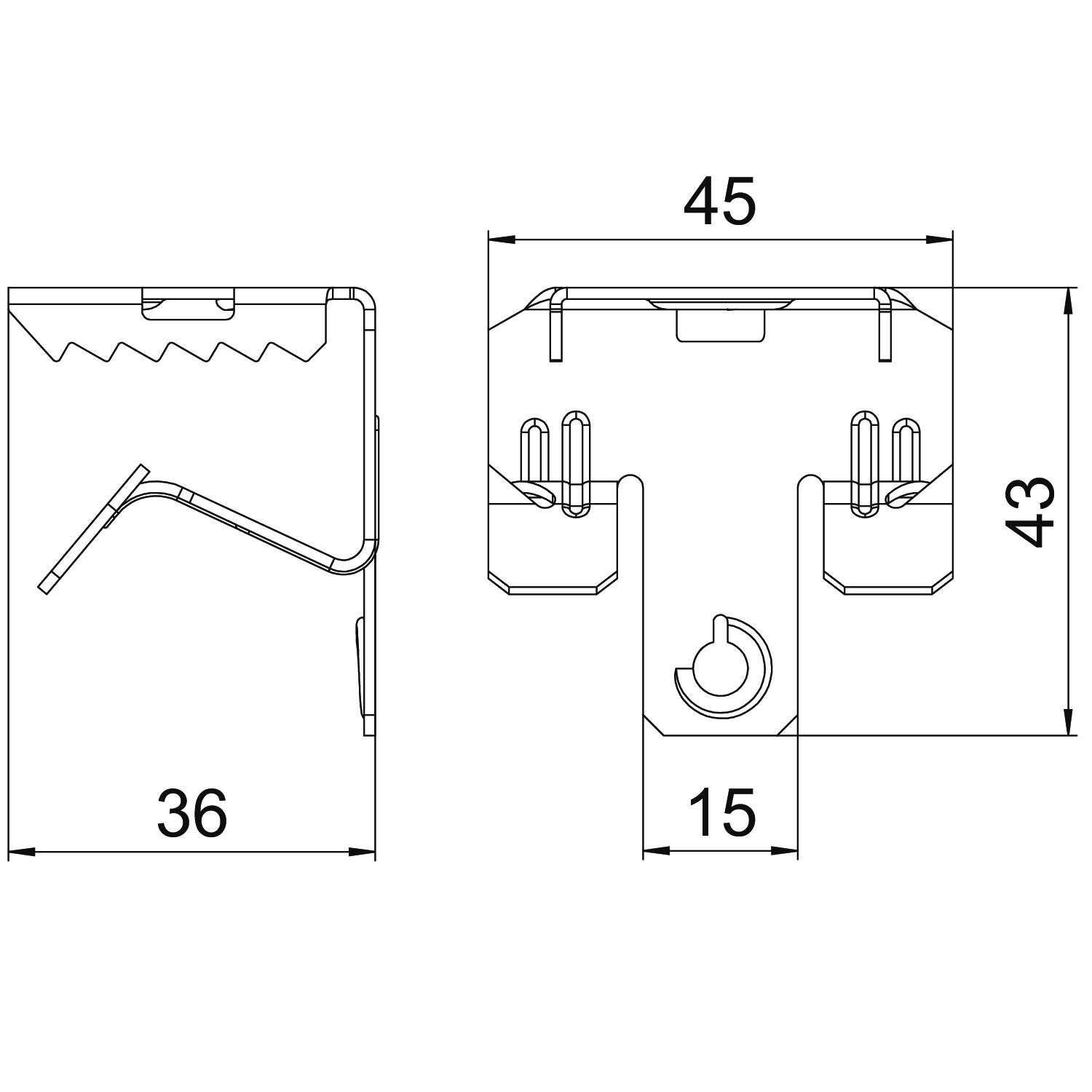 Breaking load 0,45 kN Colour zinc Connection type/component Thread Dimension 14-20mm Dimension L 43 mm Fastening type Clamp Flange thickness F max. 20 mm Flange thickness F min. 14 mm Height 36 mm Hinge, adjustable no Hinged no Length 43 mm Material Steel Surface Zinc slat Thread metric 6 Width 45 mm - All types