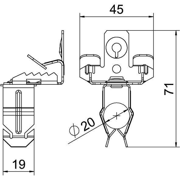 Breaking load 0,11 kN Colour zinc Connection type/component Pipe/cable Dimension 3-7mm Dimension L 71 mm Dimension W 45 mm Fastening type Clamp Flange thickness F max. 7 mm Flange thickness F min. 3 mm Height 39 mm Hinge, adjustable no Hinged no Length 71 mm Material Steel Pipe/cable diameter, max. 22 mm Pipe/cable diameter, min. 18 mm Surface Zinc slat Width 45 mm - All types