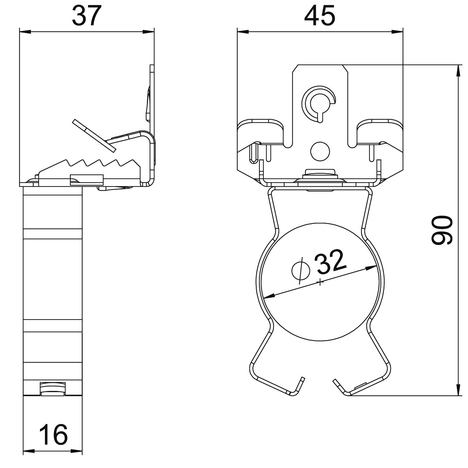 Breaking load 0,45 kN Colour zinc Connection type/component Pipe/cable Dimension 3-7mm Dimension L 90 mm Fastening type Clamp Flange thickness F max. 7 mm Flange thickness F min. 3 mm Height 37 mm Hinge, adjustable no Hinged no Length 90 mm Material Steel Pipe/cable diameter, max. 32 mm Pipe/cable diameter, min. 30 mm Surface Zinc slat Width 45 mm - All types