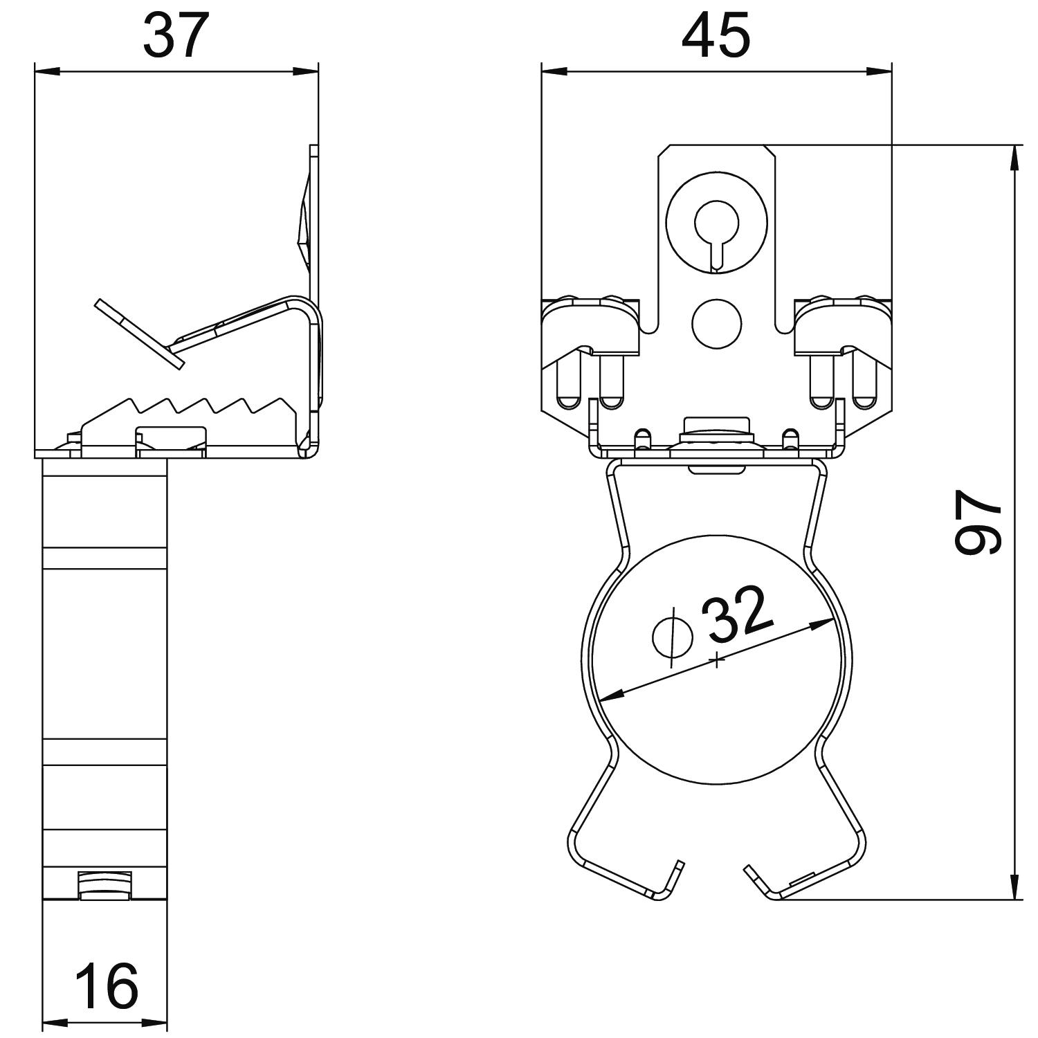 Breaking load 0,45 kN Colour zinc Connection type/component Pipe/cable Dimension 7-13mm Dimension L 97 mm Fastening type Clamp Flange thickness F max. 13 mm Flange thickness F min. 7 mm Height 37 mm Hinge, adjustable no Hinged no Length 97 mm Material Steel Pipe/cable diameter, max. 32 mm Pipe/cable diameter, min. 30 mm Surface Zinc slat Width 45 mm - All types