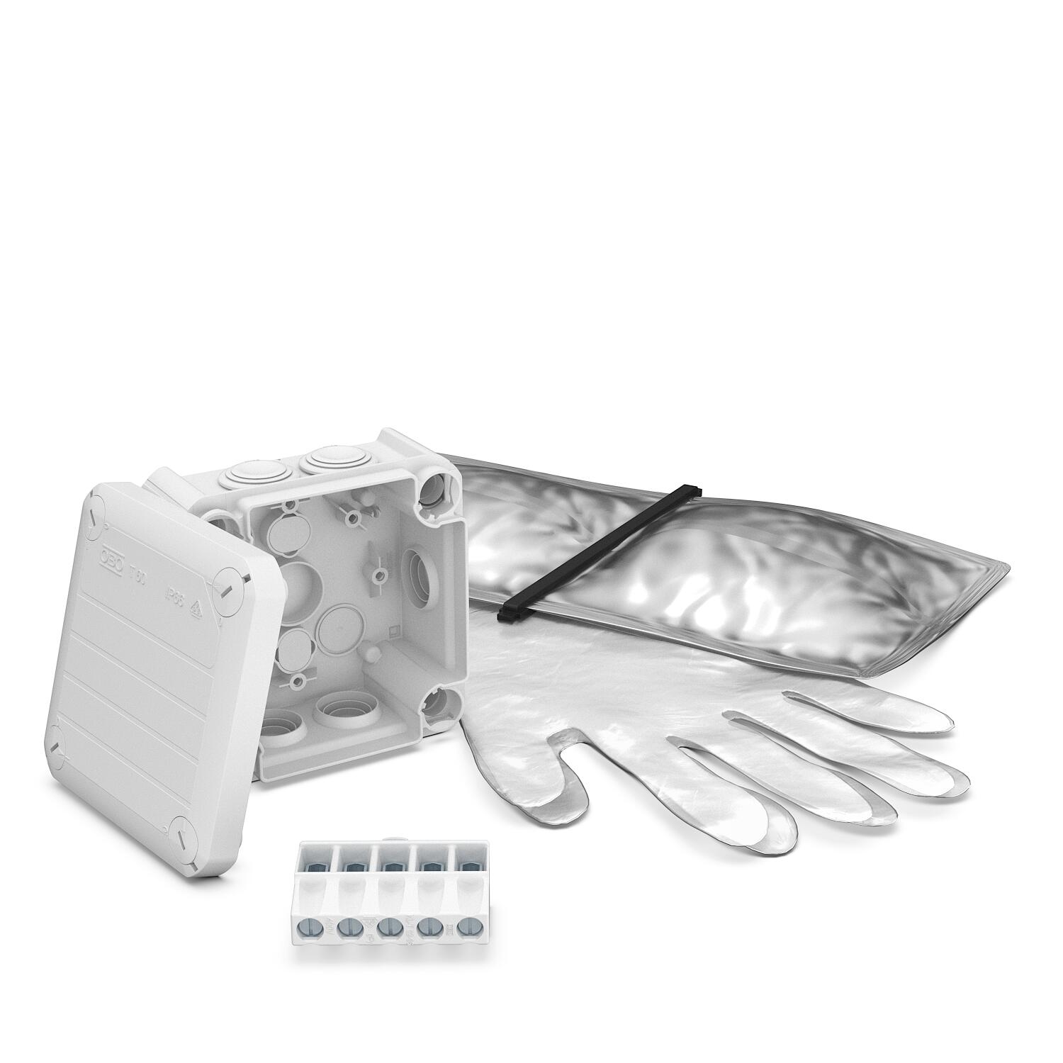 Product descriptionSet consisting of a T 60 junction box with terminal strip, casting resin and a pair of disposable gloves. 2-component casting resin in a mixing bag to protect the electrical installation against moisture, in accordance with the IP68 protection class, and mechanical loads.