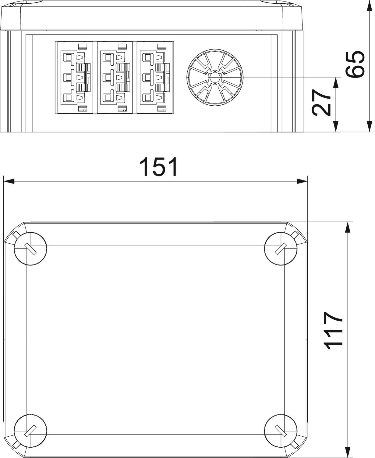 Clear internal dimensions 136x102x57 mm CO2 Footprint (GWP) Cradle-to-Gate 0,6146 kg CO2e / 1 Piece Colour Light grey; RAL 7035 Cover Not transparent Cover fastening Screwed Dimension 150x116x67 Equipment Miscellaneous Explosion-tested version no Flame-resistant acc. to VDE 0471/DIN 695 Part 2-1, test temperature 650°C For Ex zone Without For Ex zone dust Without For Ex zone gas Without Height 67 mm Length 150 mm Maintain electrical functions Without Material Polypropylene Measured insulation voltage Vi 500 V No. of entries 4 Nominal cross-section, min. 2,5 mm² Nominal voltage 500 V Permitted temperature range, max. 60 °C Permitted temperature range, min. -5 °C Protection rating IP20 Sealable yes Shape Rectangular Transparent lid no Type of entry Strain relief entries for direct penetrations for cable diameters of 7−21 mm Weatherproof no Width 116 mm with lid yes With screening no - All types