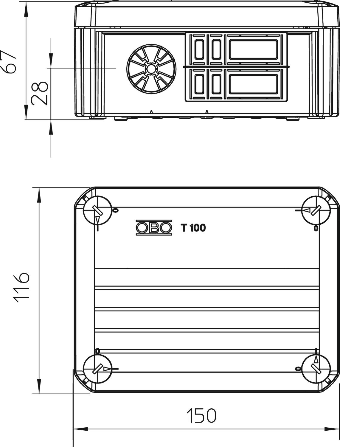 Clear internal dimensions 136x102x57 mm CO2 Footprint (GWP) Cradle-to-Gate 0,7388 kg CO2e / 1 Piece Colour Light grey; RAL 7035 Cover Not transparent Cover fastening Screwed Dimension 150x116x67 Entry from rear yes Equipment Miscellaneous Expandable yes Explosion-tested version no Flame-resistant acc. to VDE 0471/DIN 695 Part 2-1, test temperature 650°C For Ex zone Without For Ex zone dust Without For Ex zone gas Without Halogen-free yes Height 67 mm Length 150 mm Maintain electrical functions Without Material Polypropylene Measured insulation voltage Vi 500 V Mounting type Wall/ceiling mounting No. of entries 4 Nominal cross-section, min. 2,5 mm² Nominal voltage 500 V Permitted temperature range, max. 60 °C Permitted temperature range, min. -5 °C Protection rating IP20 Sealable yes Shape Rectangular Transparent lid no Type of entry Strain relief entries for direct penetrations for cable diameters of 7−21 mm Type of housing penetration Pre-marking Weatherproof no Width 116 mm with lid yes With screening no - All types