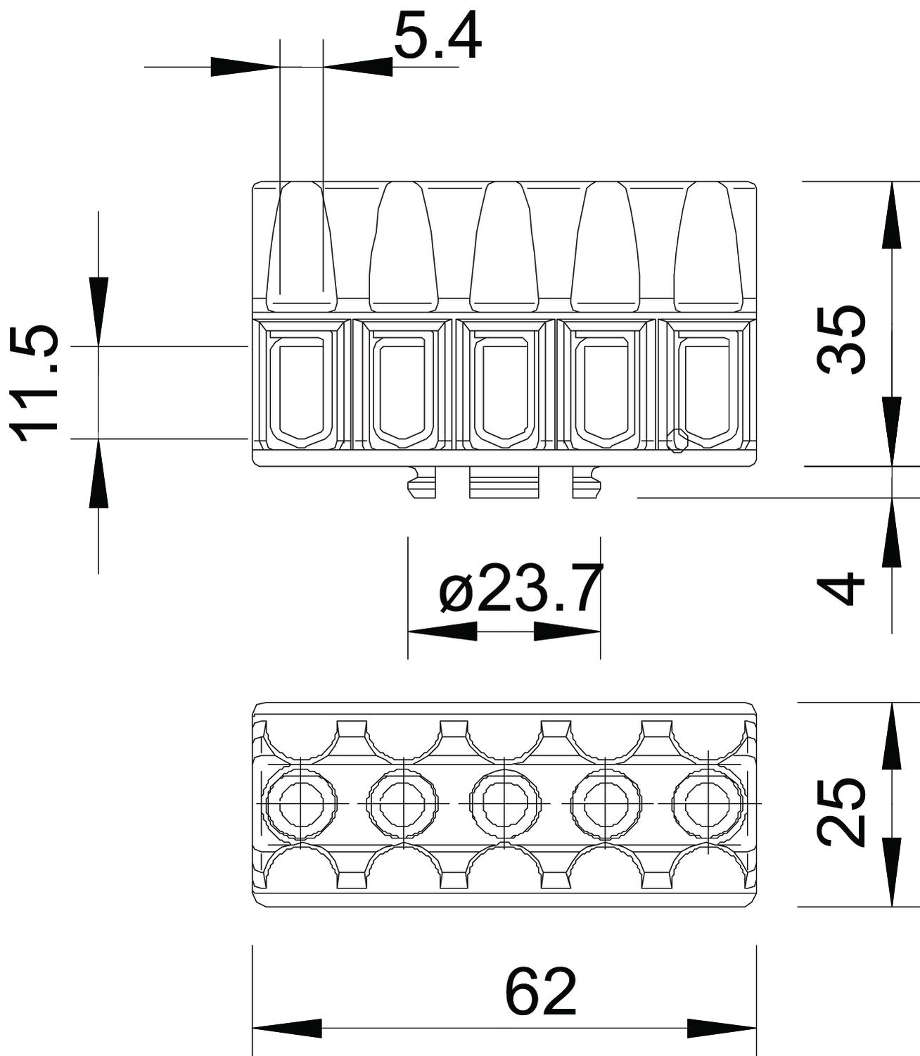 Closing plate required no CO2 Footprint (GWP) Cradle-to-Gate 0,1677 kg CO2e / 1 Piece Colour Light grey Connectable conductor cross-section, single-wire, max. 6 mm² Connectable conductor cross-section, single-wire, min. 2,5 mm² Connection position Side Cross-section Max. connectable cross-sections per terminal: 3 x 6 mm², 4 x 4 mm² or 6 x 2.5 mm² mm² Dimension 6mm² Explosion-tested version no Height 35 mm Insulation material Thermoplast Length 62 mm Material Polyamide No. of terminals 5 Nominal cross-section, max. 6 mm² Nominal cross-section, min. 1,5 mm² Nominal current 41 A Nominal voltage 400 V Number of screwless terminals per pole 1 Pole number 5 Transparent no Version of electrical connection 1 Screw connection Width 25 mm - All types