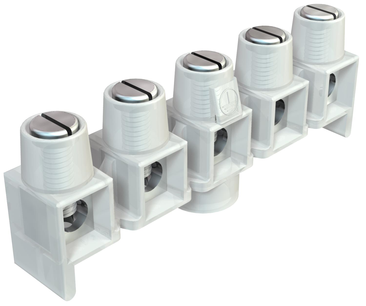 Product descriptionBrass terminal block, nickel plated, steel screws, electrogalvanised and transparently passivated, nominal cross section 0.8 ÷ 2.5 mm², nominal voltage 660 V, 5-pin, with socket terminals, max. connectable cross sections per terminal: 4 x 2.5 mm², 5 x 1.5 mm² or 6 x 1 mm², unused pins can be disconnected and used as individual terminals.