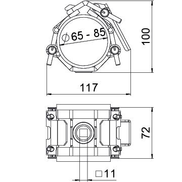 Cable diameter, max. 85 mm Cable diameter, min. 60 mm Clamping range D, max. 85 mm Clamping range D, min. 60 mm Dimension 60-85 For pipe diameter, max. 85 mm For pipe diameter, min. 60 mm Height 110 mm Length 125 mm Mounting type Profile rail Number of cables/pipes 1 Plate thickness 2 mm Width 72 mm - All types